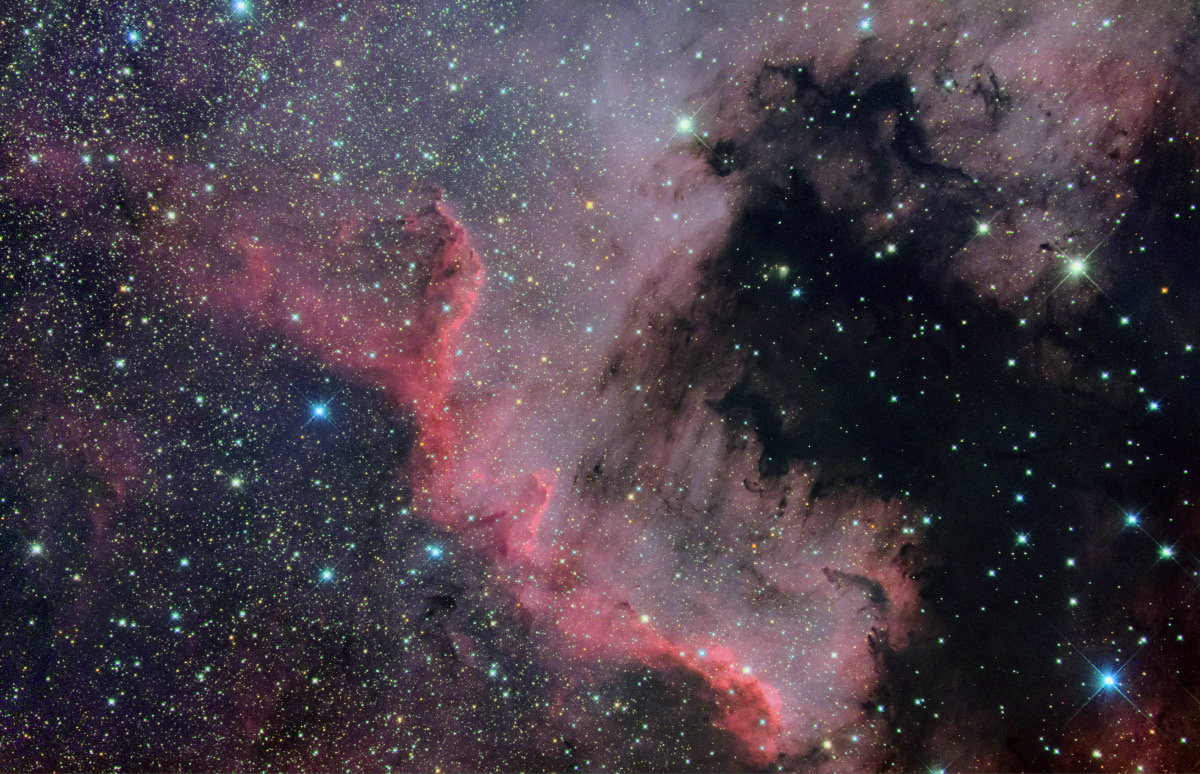 北アメリカとペリカン星雲 夏のお馴染み天体である北アメリカ星雲とペリカン星雲の 写真です。 はくちょう座に存在するこの大きな星雲は、大きくて写真写りもよいことから天体写真 ファンには大人気の星域です。幸い日本からは天頂付近に見えるので条件もよく、長い季節に渡って撮影北アメリカ星雲 NGC7000とペリカン星雲 IC5067, 5070 北アメリカ星雲およびペリカン星雲周辺を、Nebula Booster NB1フィルターを用いて狙ってみました。Hα線で輝く淡い散光星雲には効果絶大で、その特徴的な姿をかなりはっきり捉えることができました。 · 北アメリカ星雲 北アメリカ星雲の概要 北アメリカ星雲1North America Nebulaペリカン星雲を含む北アメリカ星雲SII = 赤, Halpha = 緑, OIII = 青仮符号・別名NGC 7000、Sh2